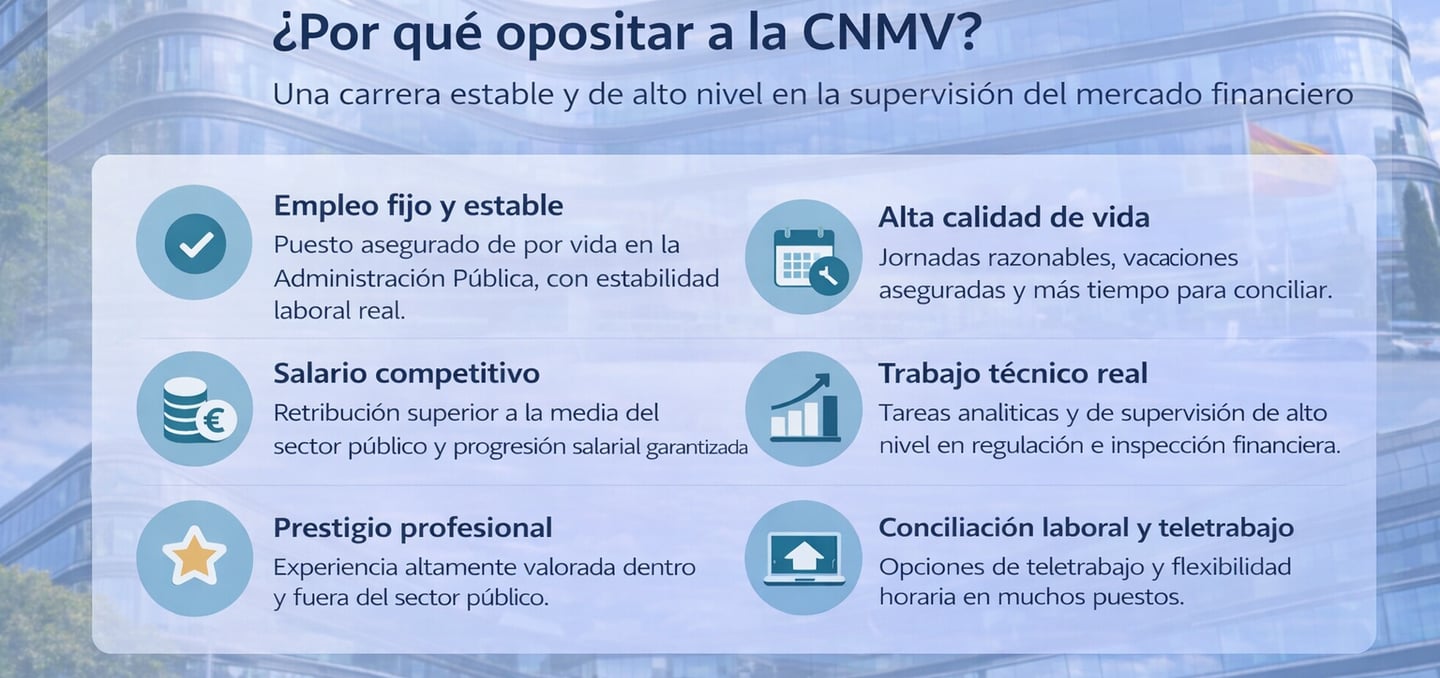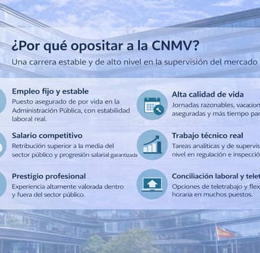 Trabajar en la CNMV significa formar parte de una institución clave para la estabilidad económica del país, con un alto nivel técnico, proyección profesional y reconocimiento dentro del sector financiero.